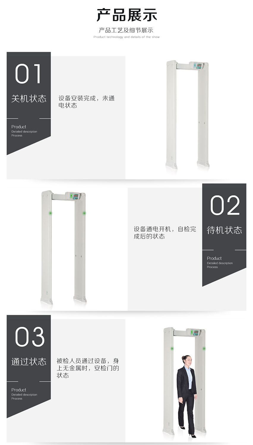 HC-TY300D金屬探測門(橫梁式)感應快、探測準、靈敏度高、抗干擾強、高穩定性,電源設計在主機頂端,防水防潮,非常人性化;能滿足各行業用戶需求。此款安檢門嚴格執行國家《GB15210-2003通過式金屬探測門技術通用技術規范》;